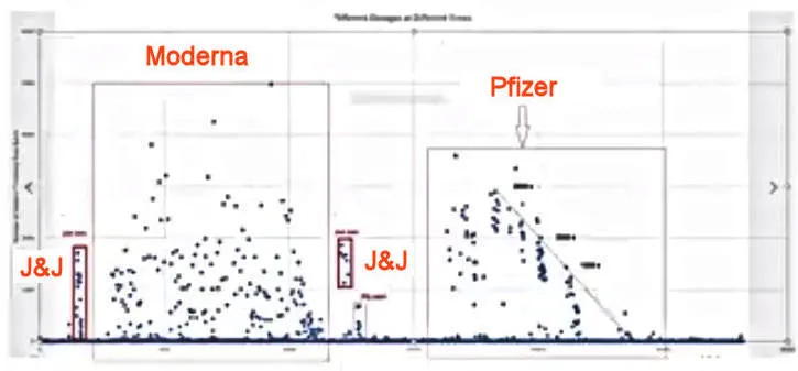 Johnson and Johnson ran the first tests. Their results are in the small red rectangle on the left. Next, casualties from Moderna are shown in the left-hand square. J and J did a brief second test (the middle red rectangle). Pfizer took over during the second half of the experiment, and their deaths and injuries are shown in the right-hand box.