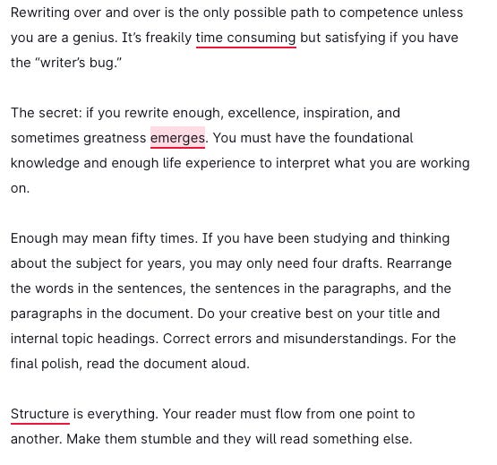 You should check your writing by copying and pasting each chapter into a website that measures grade level such as the one HERE. The lower the grade level, the easier the writing is to read. The document you are reading is at a seventh-grade level, which is excellent. My first book was at the 11th-grade level, and my second, written after more practice, was at the 9th.