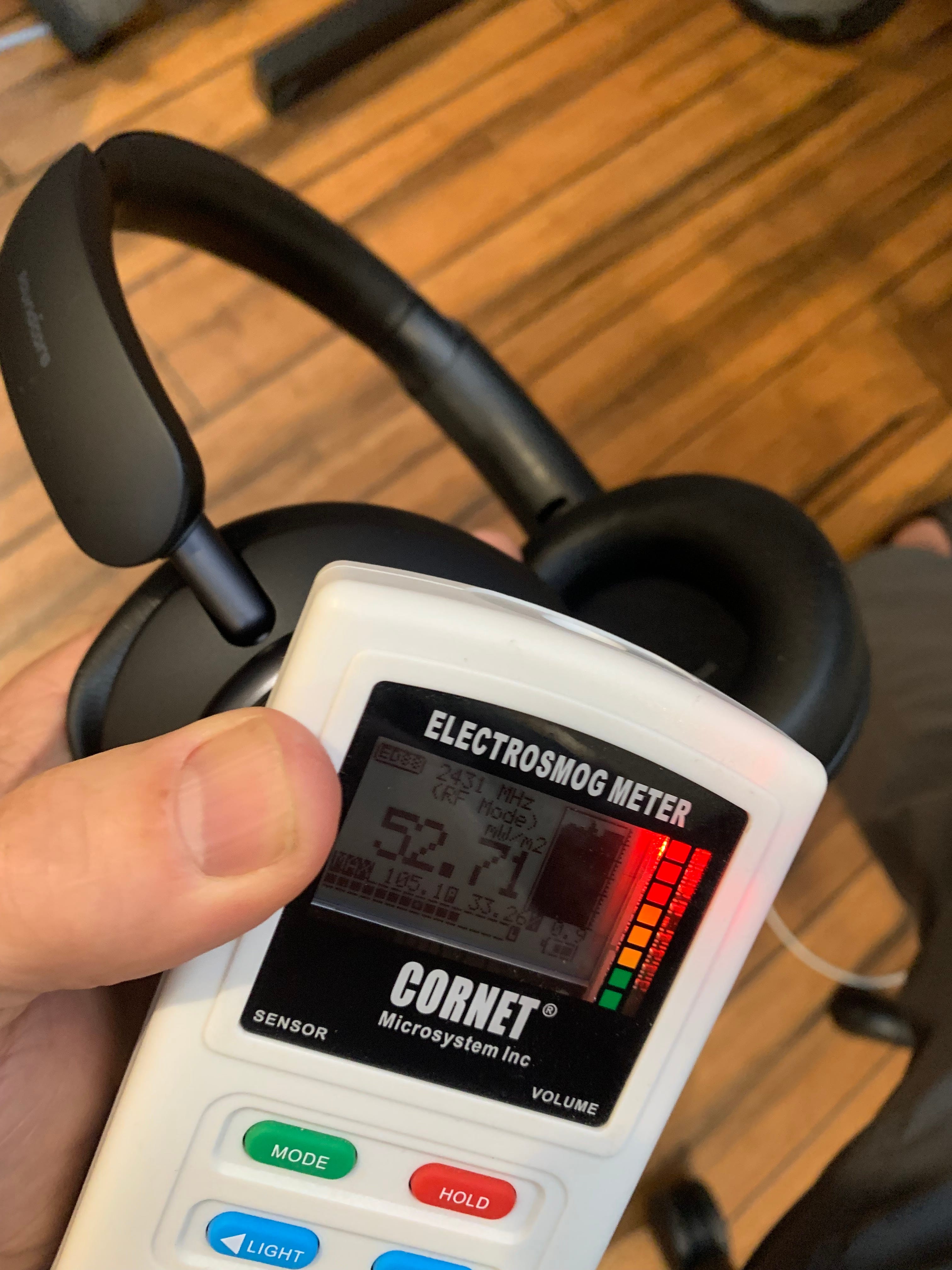 Fortunately, the headphones I examined all come with cords (iPhones require a lightning adapter). Put your cell phone in airplane mode with Bluetooth and wifi off and listen to podcasts and music offline. The meter went green when I did this for both Bose headphones and the cheaper Soundcore above. "Air gap" earpieces such as Linden are inexpensive and even safer. I stopped charging my headphones, so they could not turn on accidentally.