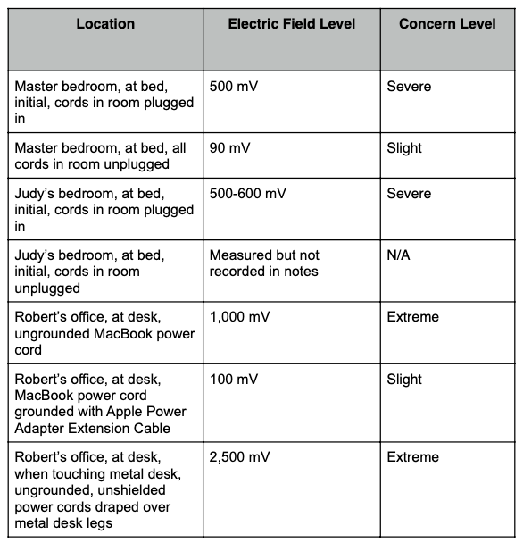 We aim to reduce bedroom nighttime electric field exposure levels to as close to or below 1.5 Volts/meter or 100 milliVolts as possible. The way we do this in your home is to unplug the plastic AC cords to lamps and other electric devices on the bedside tables at night. I have inexpensive switches that can accomplish this.