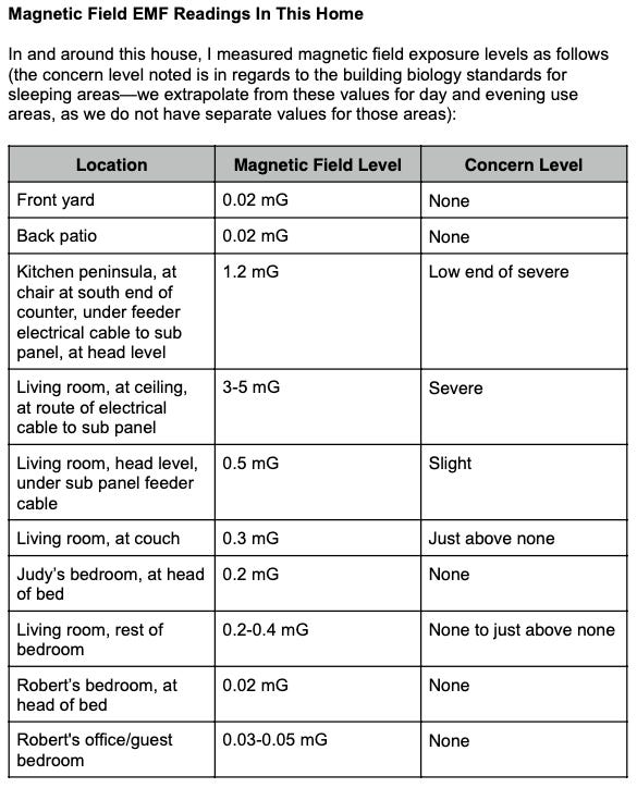 A few days after his visit, Mr. Miller sent me a 30-page letter with explanations and recommendations. He notes, "This is a specific report for you and is not a definitive set of recommendations for everyone. Other people would have a different mix of EMFs in their house, generating somewhat different recommendations."