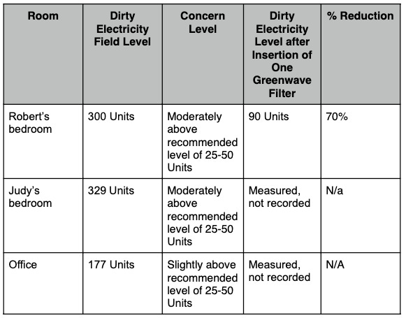 I measured the following levels of dirty electricity in the Yoho home, along with the levels they reduced to after I plugged in one Greenwave filter: