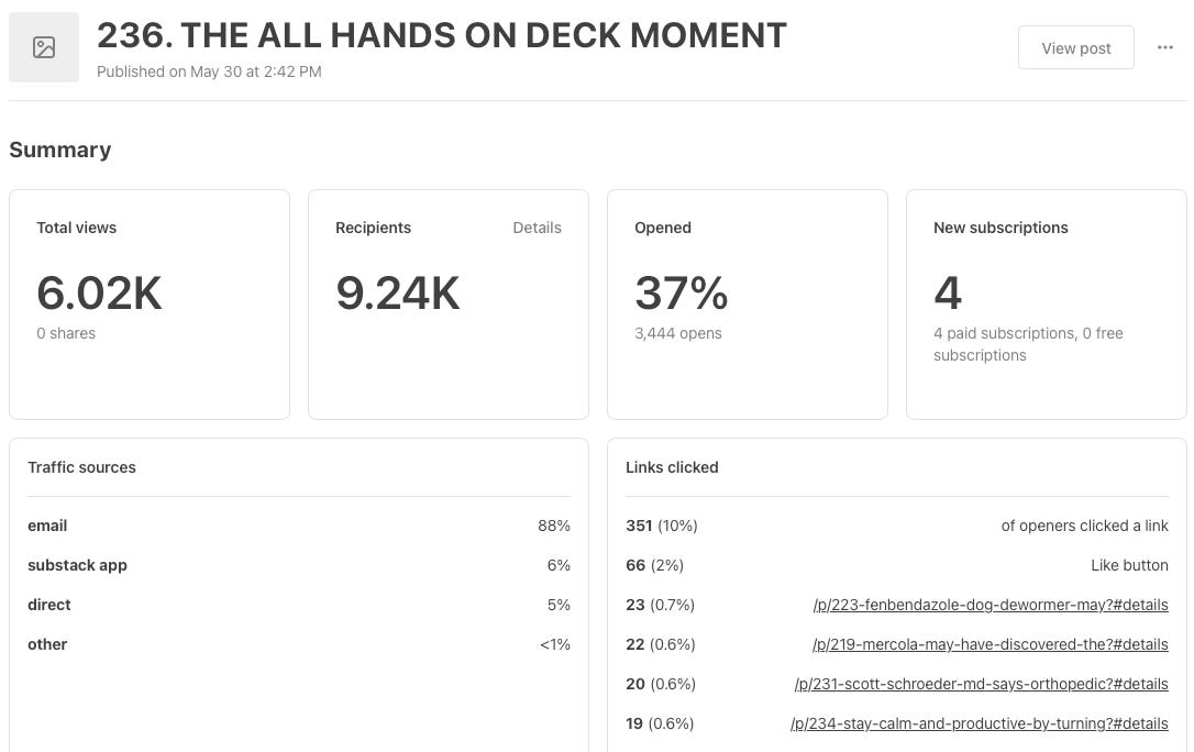 Substack love. The post below had 235 comments three days after publication. Thanks for your help, and I’m working through your suggestions. Everything is time-consuming these days.