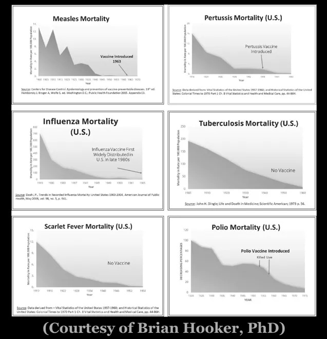 Every other vaccine, including the ones for childhood, is a significant harm (see HERE and HERE). Over the last thirty years, these caused the US autism rate to increase from 1/10,000 to 1/30. Like the psych drugs, no vaccine has been studied against proper placebos. Public health measures such as sanitation produced the following drops in death rates, not vaccines.