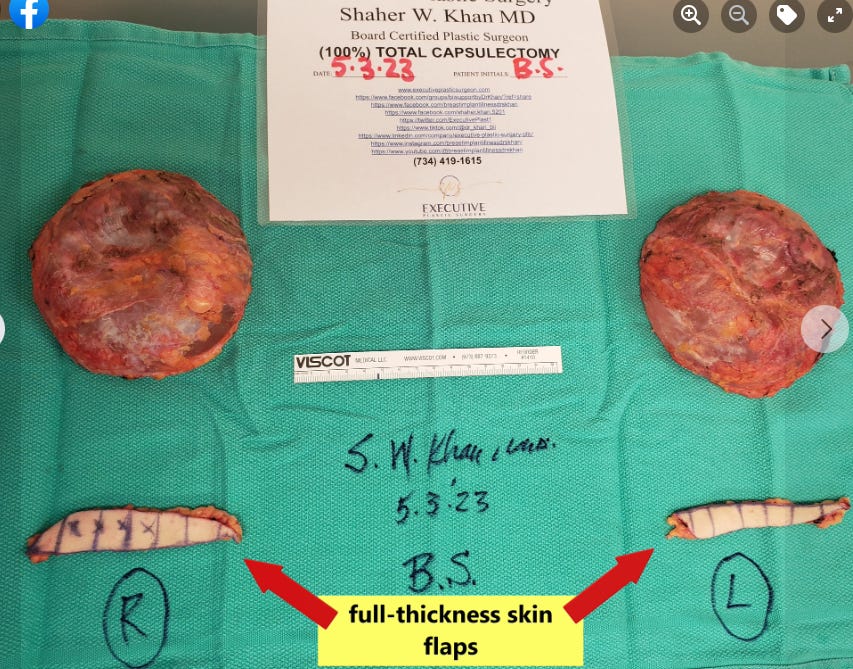 Dr. Khan says that the implant and the entire scar around the implant must be removed in one piece en bloc to relieve breast implant illness symptoms and ensure proper healing. HERE is another video. This requires superior surgical skills and usually takes four hours or more. It is a young man's game and requires an athlete's endurance. Although I did a few lengthy procedures such as facelifts, by the end of my career I could barely tolerate them.