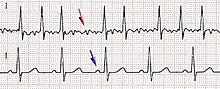 In the normal heart of the lower tracing, “P” waves (lower arrow) arise from the atrial chamber at the heart’s top. The “wiring” in this area beats slowly and regularly to initiate each P wave and then heartbeat. The larger “QRS” waves after these are the electrical activity of the major heart chambers.