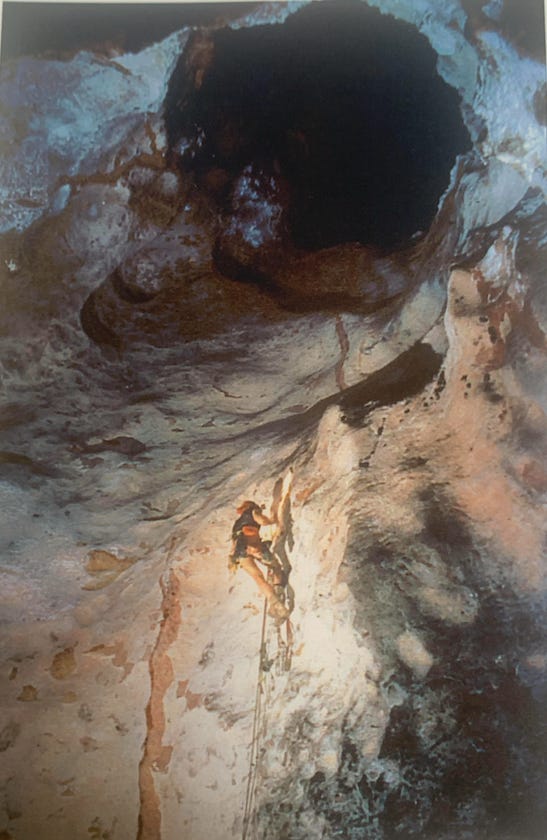 This was Dave Jones in the lead, and we were several miles underground. We were trying to get to the black hole above to see if there was an opening to a new section of cave up there. I was below him belaying.