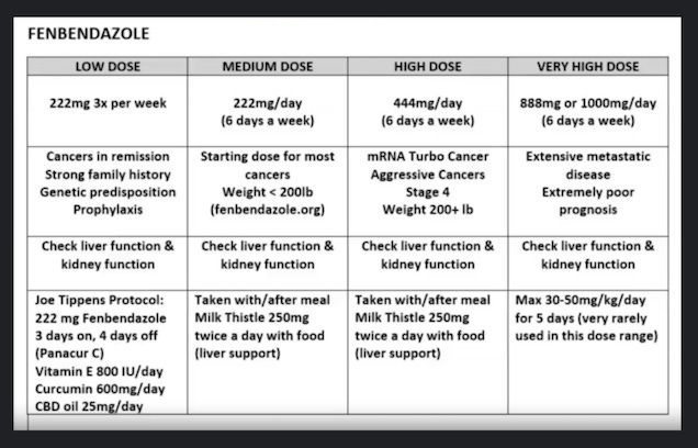 ★ Consider adding fenbendazole 222 mg five days a week, especially if you are in a dire situation or are stage 4. I buy it at Fenbenlab.com. This drug keeps working, shows no tolerance, and has many anti-cancer mechanisms of action. It seems to synergize with ivermectin. If your liver function is poor, consider lower doses. The following is one source but do your research.