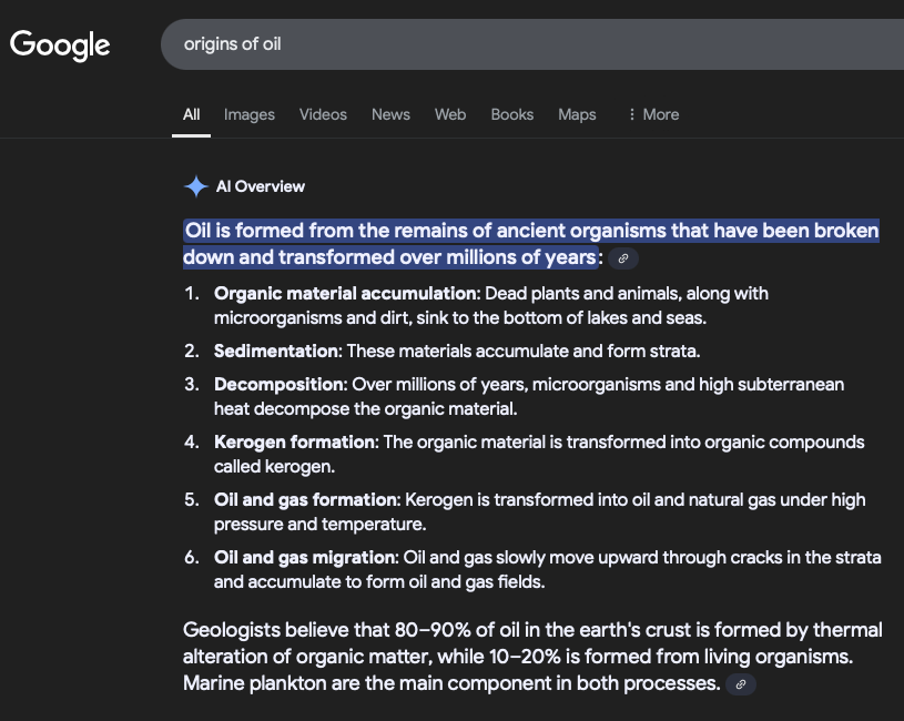 During World War II, German scientists developed the Fischer-Tropsch Process to produce synthetic oil. This demonstrated how hydrocarbons could form through natural chemical processes without biological input. The method proved so successful that synthetic oil met up to 75% of Nazi Germany's fuel demand during the war⁵.* After the war, this knowledge was transferred to both the United States through Operation Paperclip and to the Soviet Union, where it influenced the development of the Russian-Ukrainian Theory of Deep, Abiotic Petroleum Origins⁶.