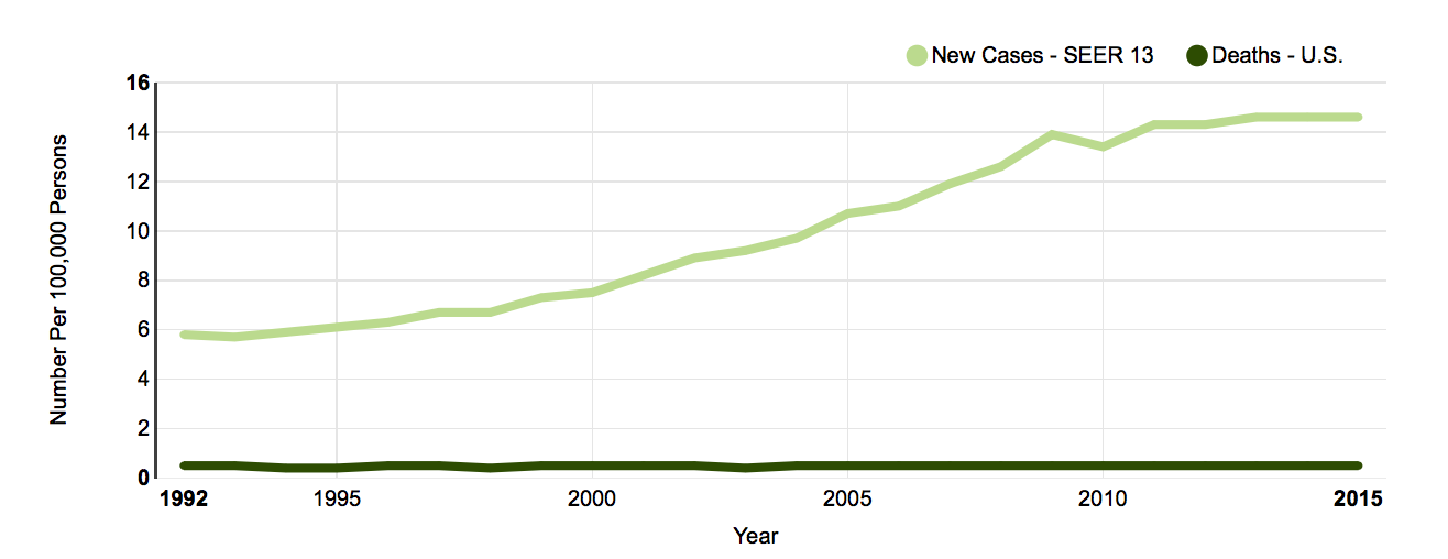 Kidney cancer shows a similar pattern. Increases in diagnosis (top line) make the incidence seem to rise, but this has helped no patients. The cancer deaths (lower line) are the same year over year from 1992 to 20143.