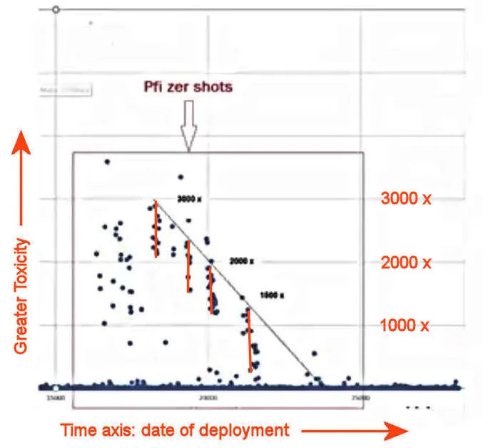 The entire study is shown in the first slide below. The horizontal axis is time. Each blue dot is a manufacturing batch or lot with thousands of bottles with the same serial number. The higher on the vertical axis a blue dot appears, the more deaths and other AEs were reported for the lot. The experiment was run over most of 2021.