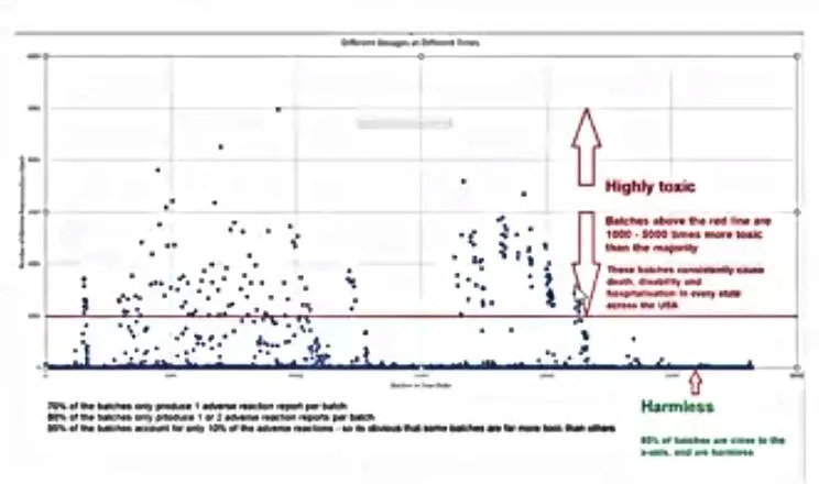 Although the dots/batches/lots above the blue baseline are all toxic, the hot lots are above the red line. These batches produce 1000-5000 deaths, disabilities, and other adverse events each and are 3000 to 5000 times riskier than the ones at the baseline.