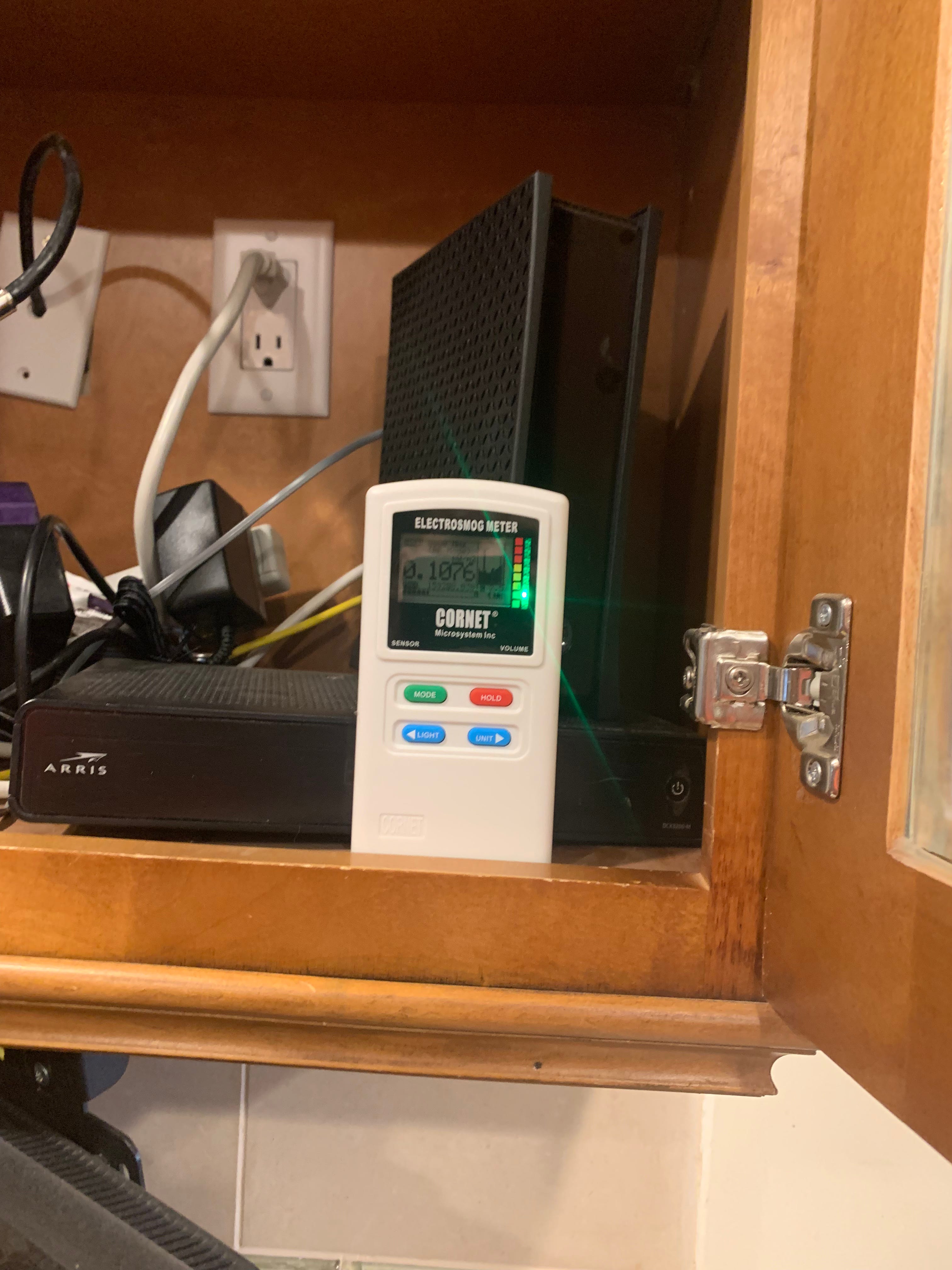I was turning off my router and the WiFi source at night, but the surrounding area still showed red on the meter. Then I discovered another EMF source, an “extender” that I had left plugged into an adjacent live socket. When I got rid of that, the meter went green.