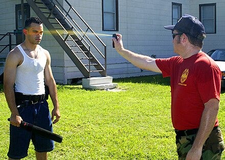 I carry the pepper spray along with my Matriarch self-defense knife and a Glock 26 semiautomatic handgun, mainly to reassure myself that I am still dangerous. Since I get to bed early and avoid barfights when I can, I seldom need any of it. I have used the spray on aggressive dogs, and they run off and become respectful from then on.