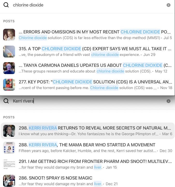 The box below is another search for Kerri Rivera. The top two, #298 and #288 are about her. Below these, posts #291 and #286 describe the affiliate programs for the commercial chlorine dioxide products. These can get you discounts and make you money. If you choose to start your chlorine dioxide journey there, buy the raw drops and start making it yourself.